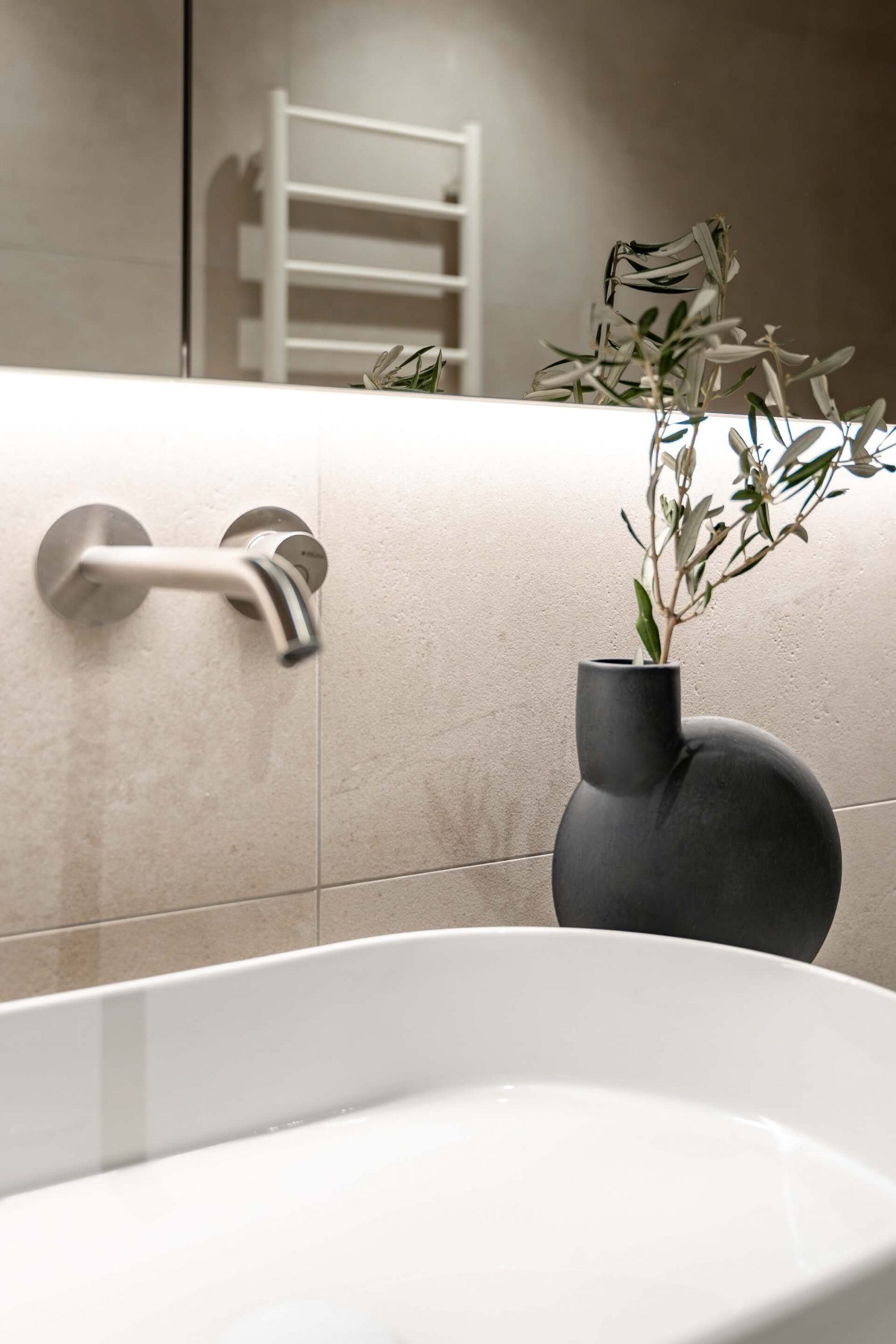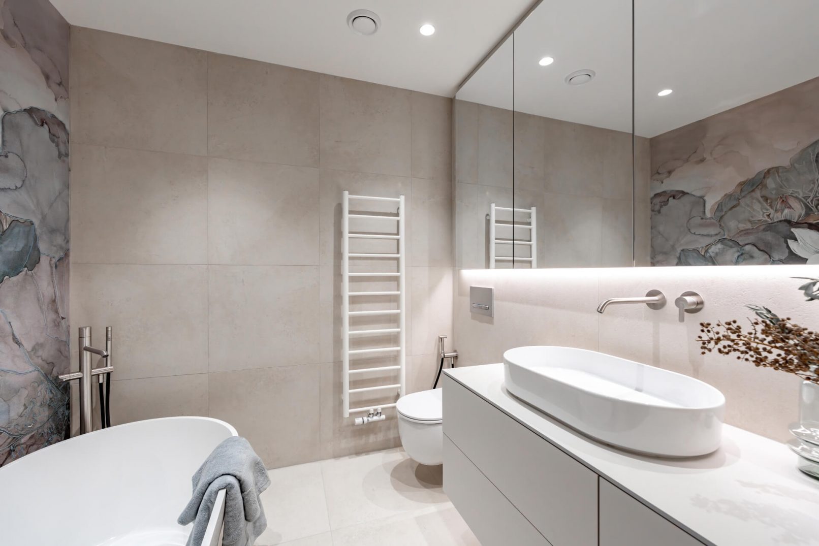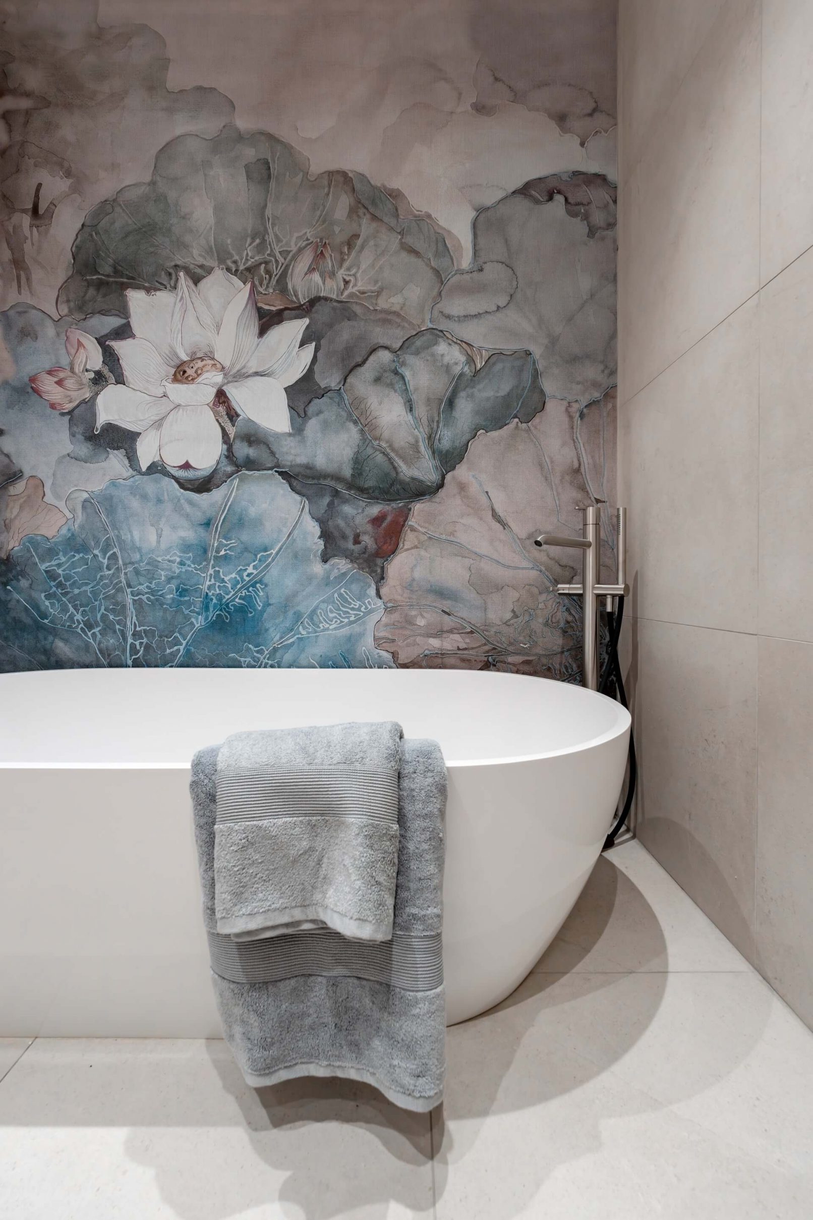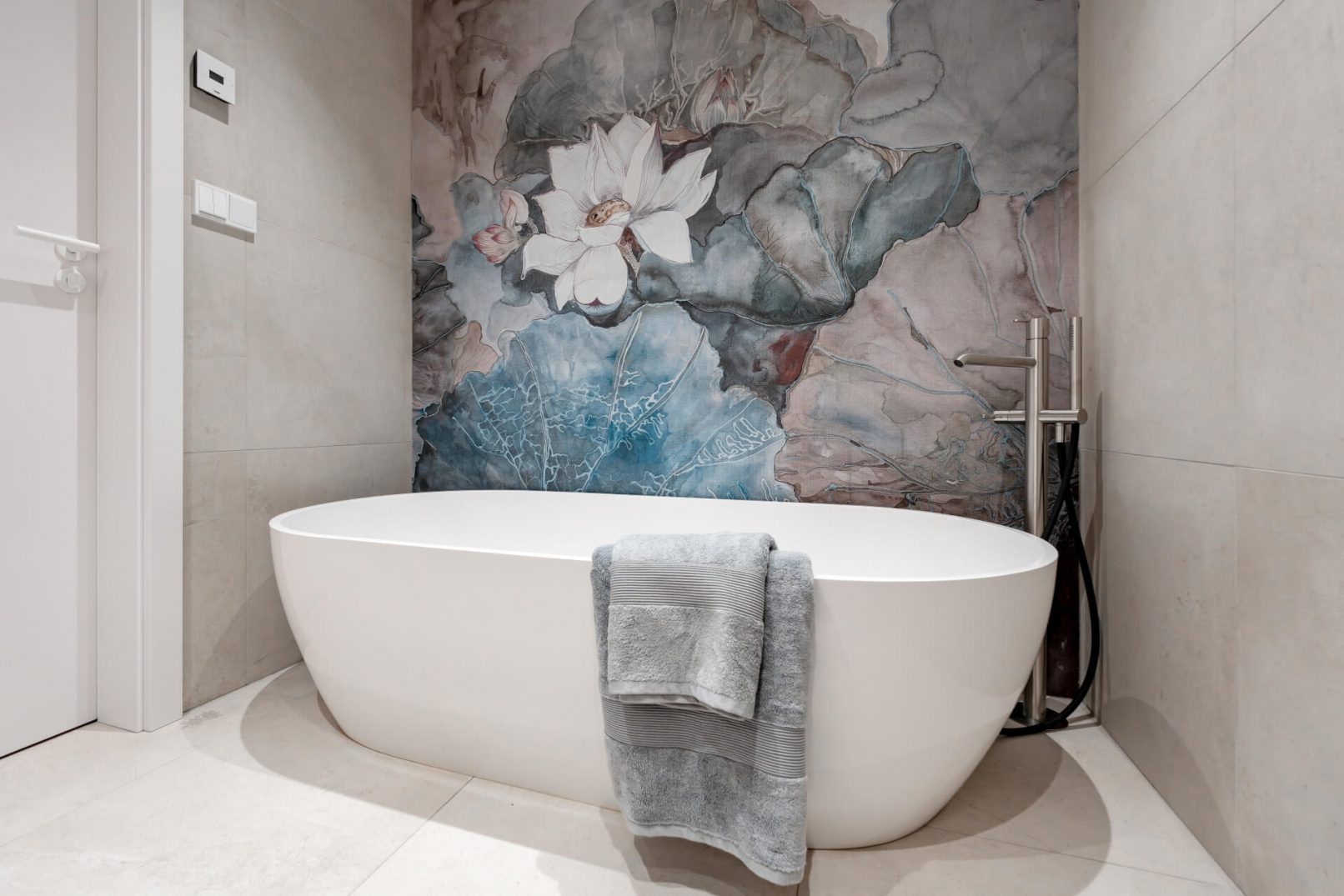Vestavný nábytek byl vyroben na míru danému prostoru a to včetně bílých lakovaných dveří. Na podlaze je mořená dřevěná podlaha Frevini v odstínu Choco v pokládce herrigbone. Olištováno je vysokými bílými lištami. Za vanou je tapeta vhodná do vlhkého prostředí. Dlažba a obklady byly voleny v jemných zemitých tónech.