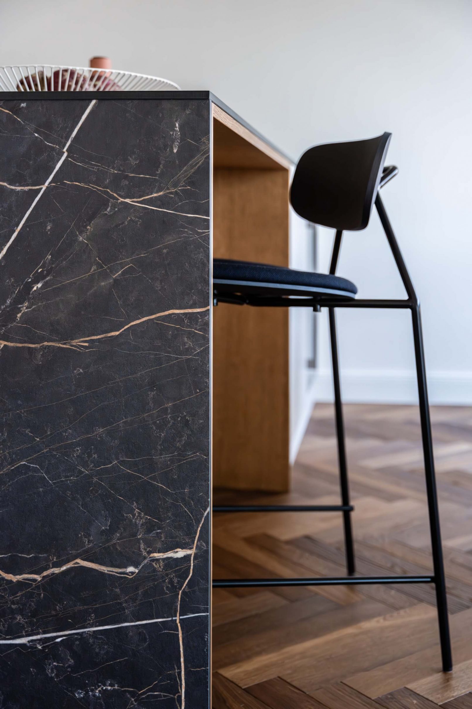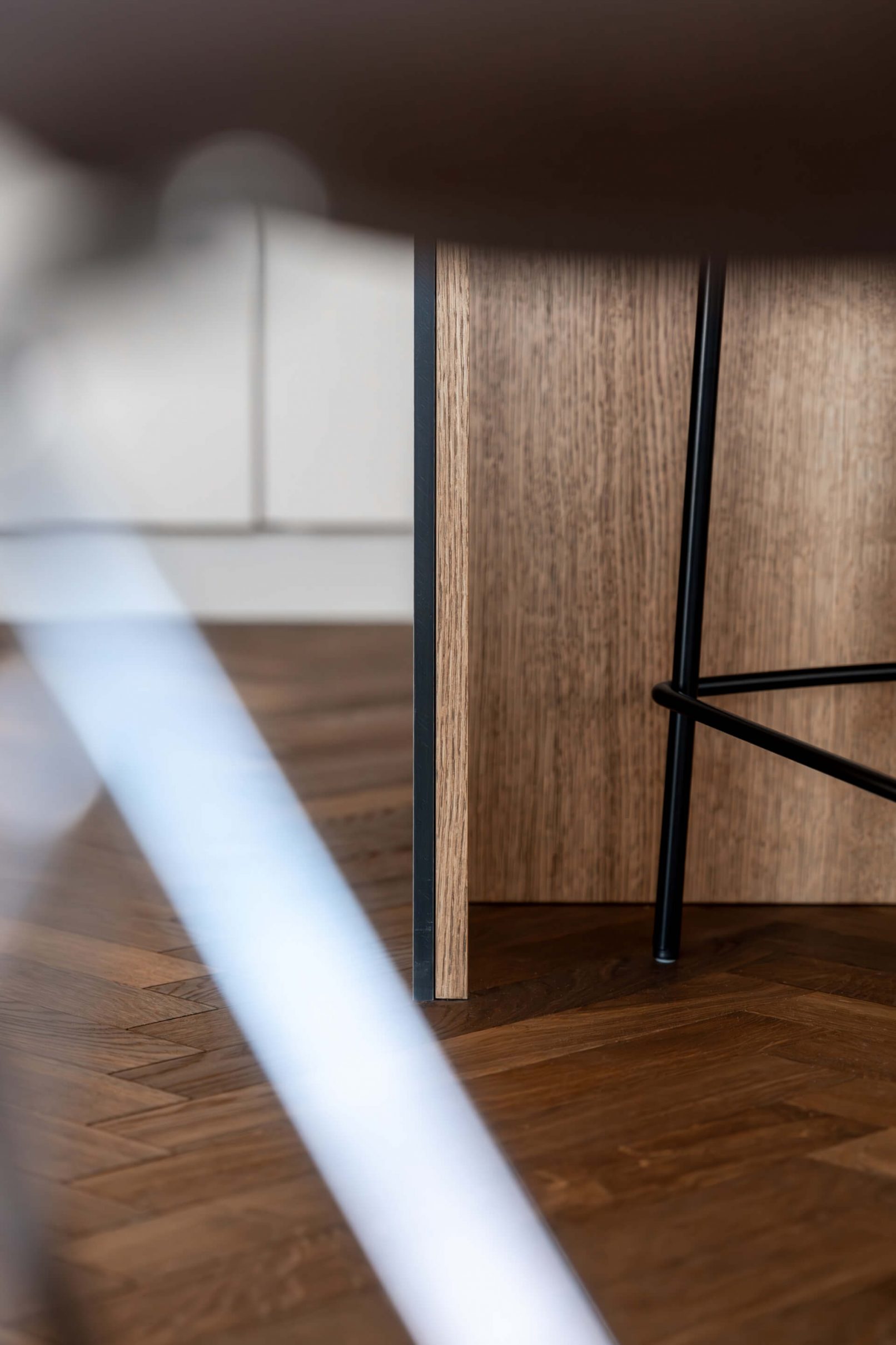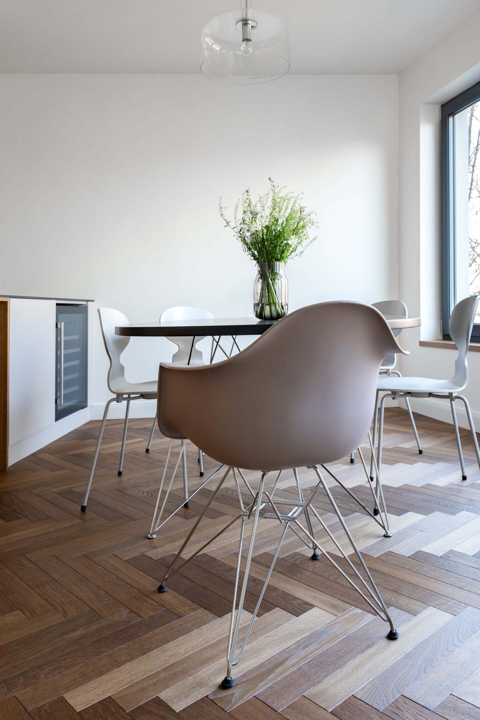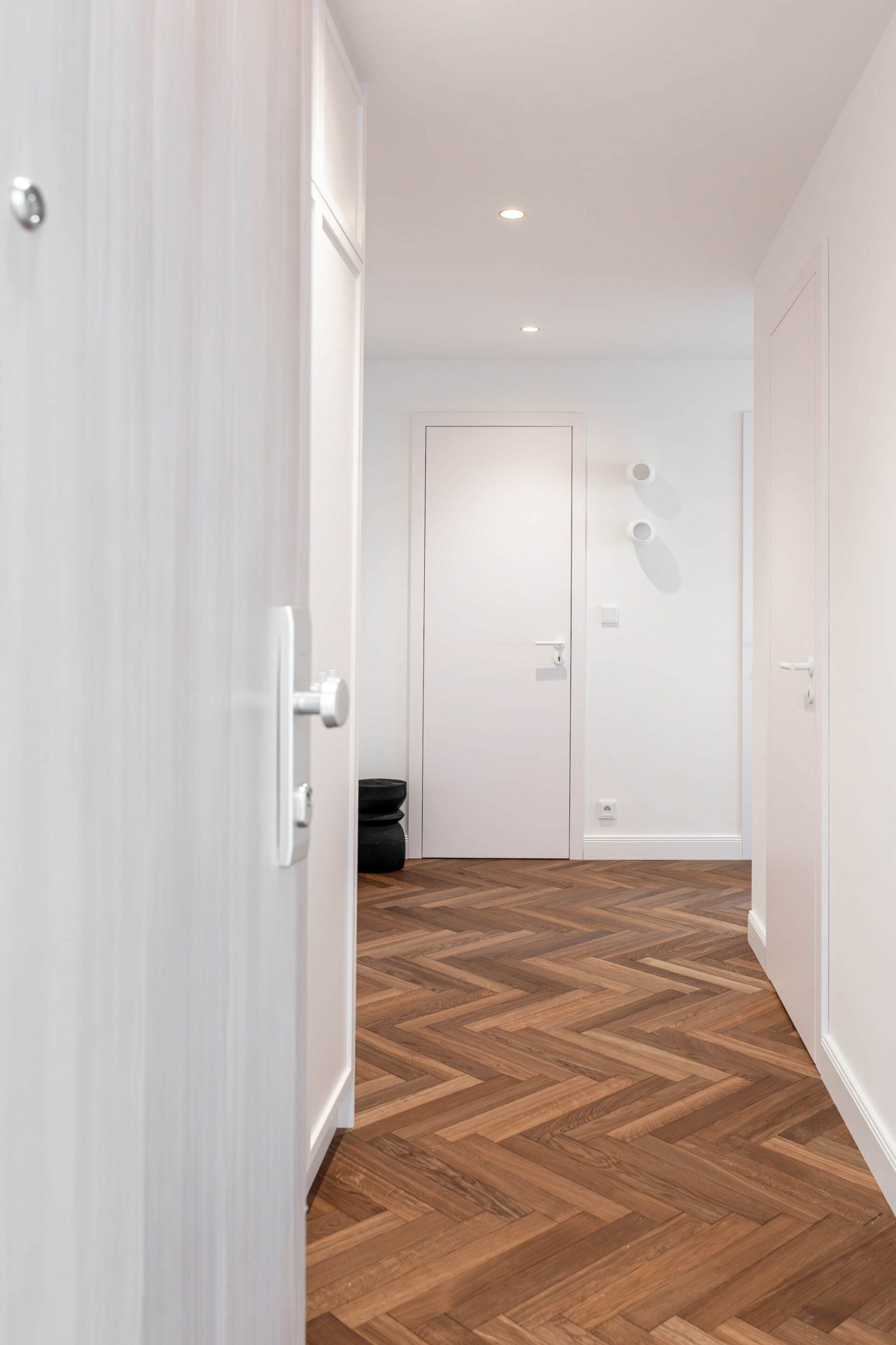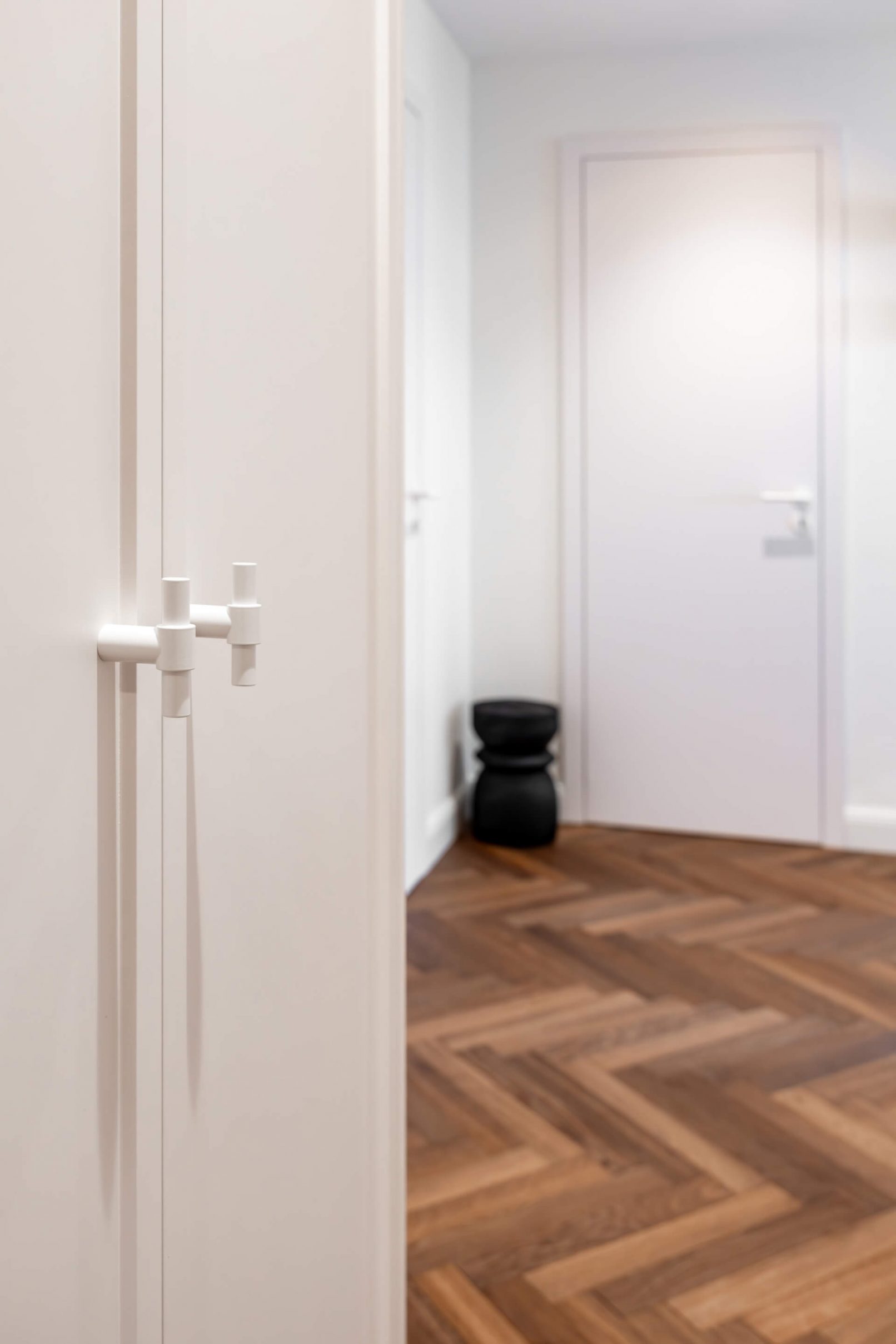 Vestavný nábytek byl vyroben na míru danému prostoru a to včetně bílých lakovaných dveří. Na podlaze je mořená dřevěná podlaha Frevini v odstínu Choco v pokládce herrigbone. Olištováno je vysokými bílými lištami. Za vanou je tapeta vhodná do vlhkého prostředí. Dlažba a obklady byly voleny v jemných zemitých tónech.