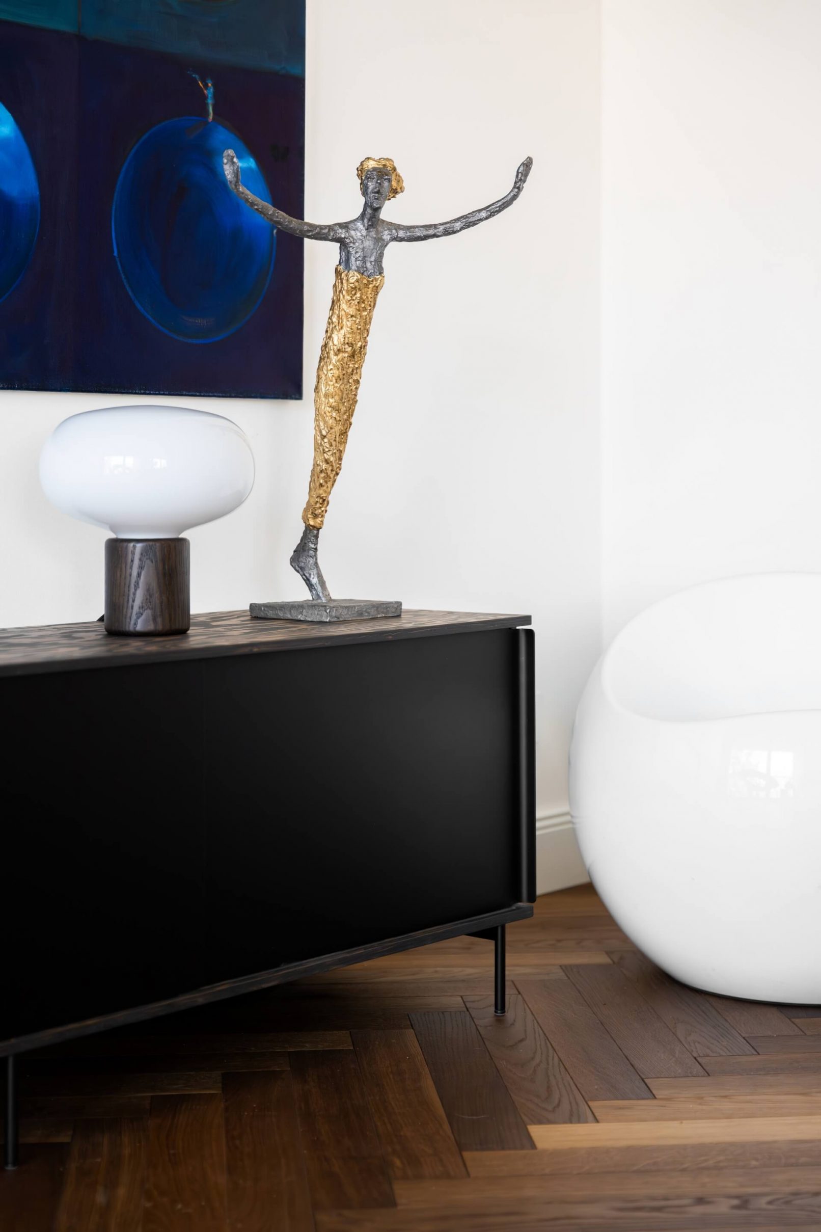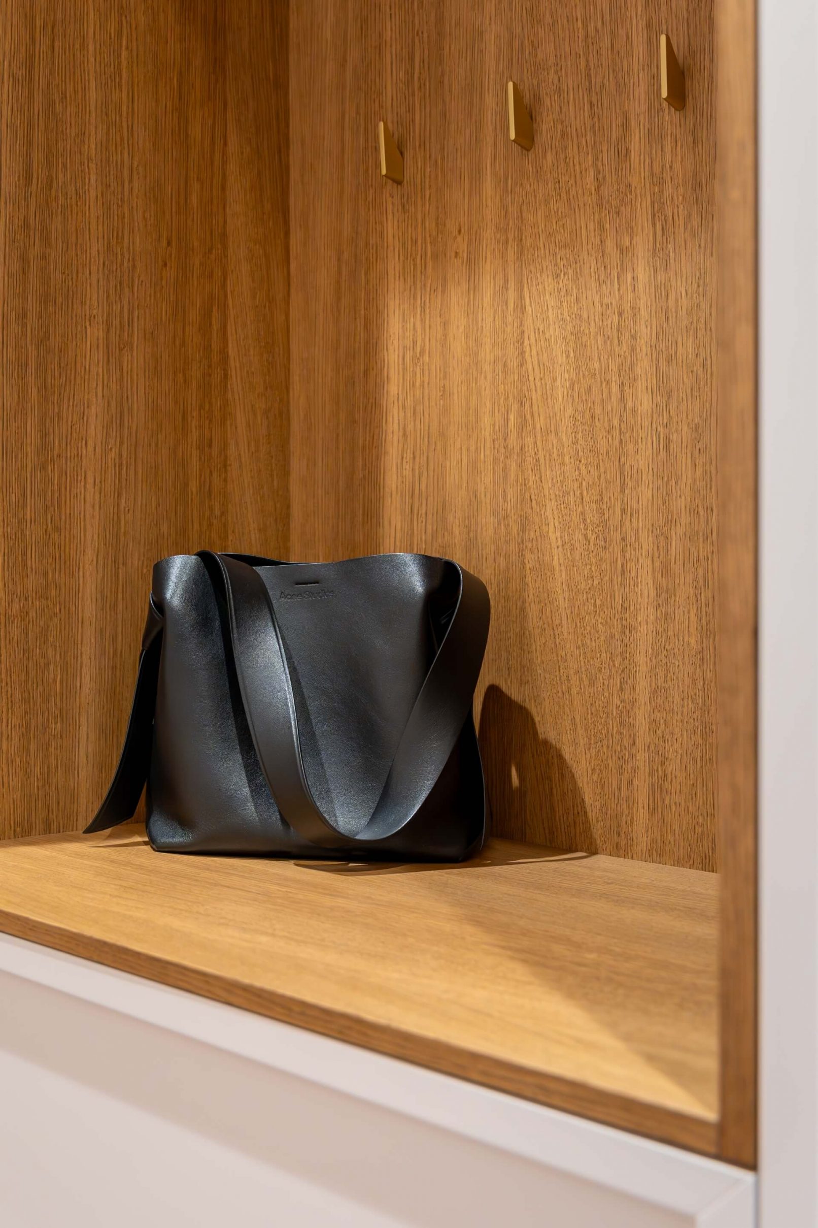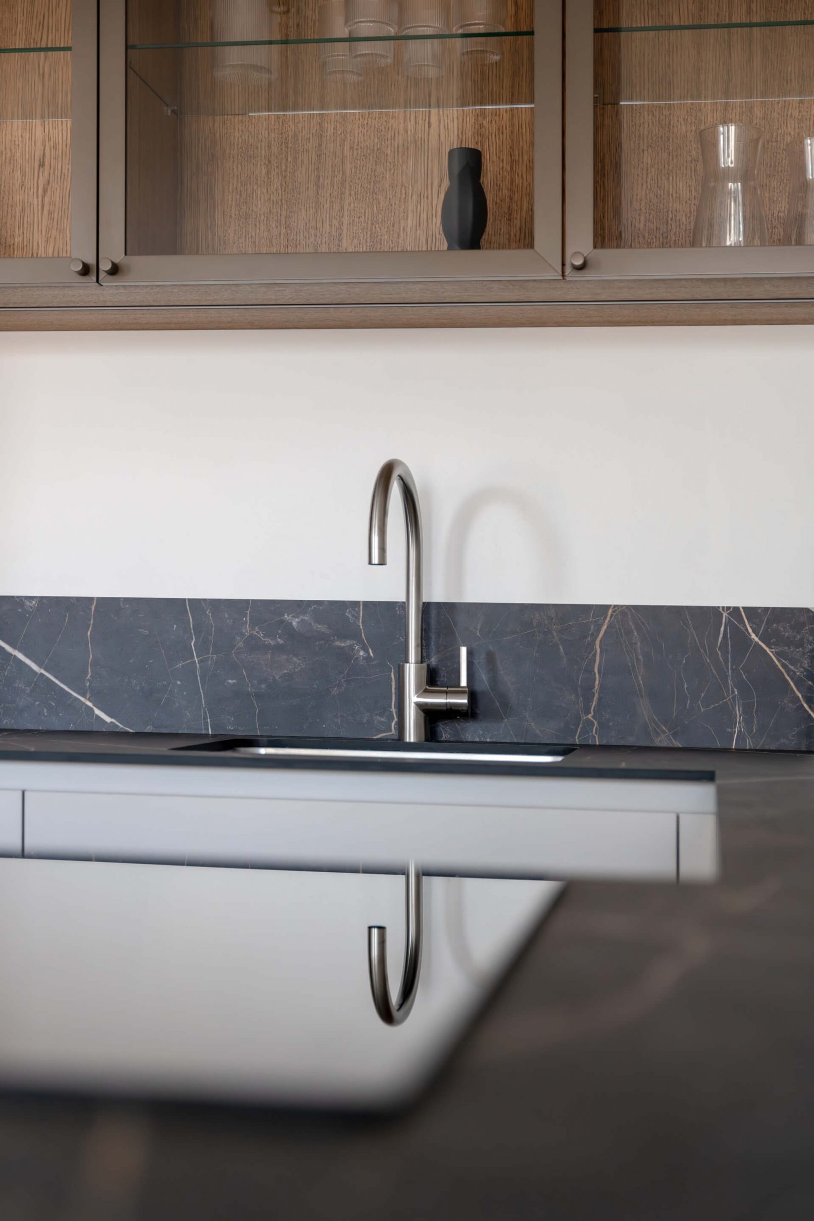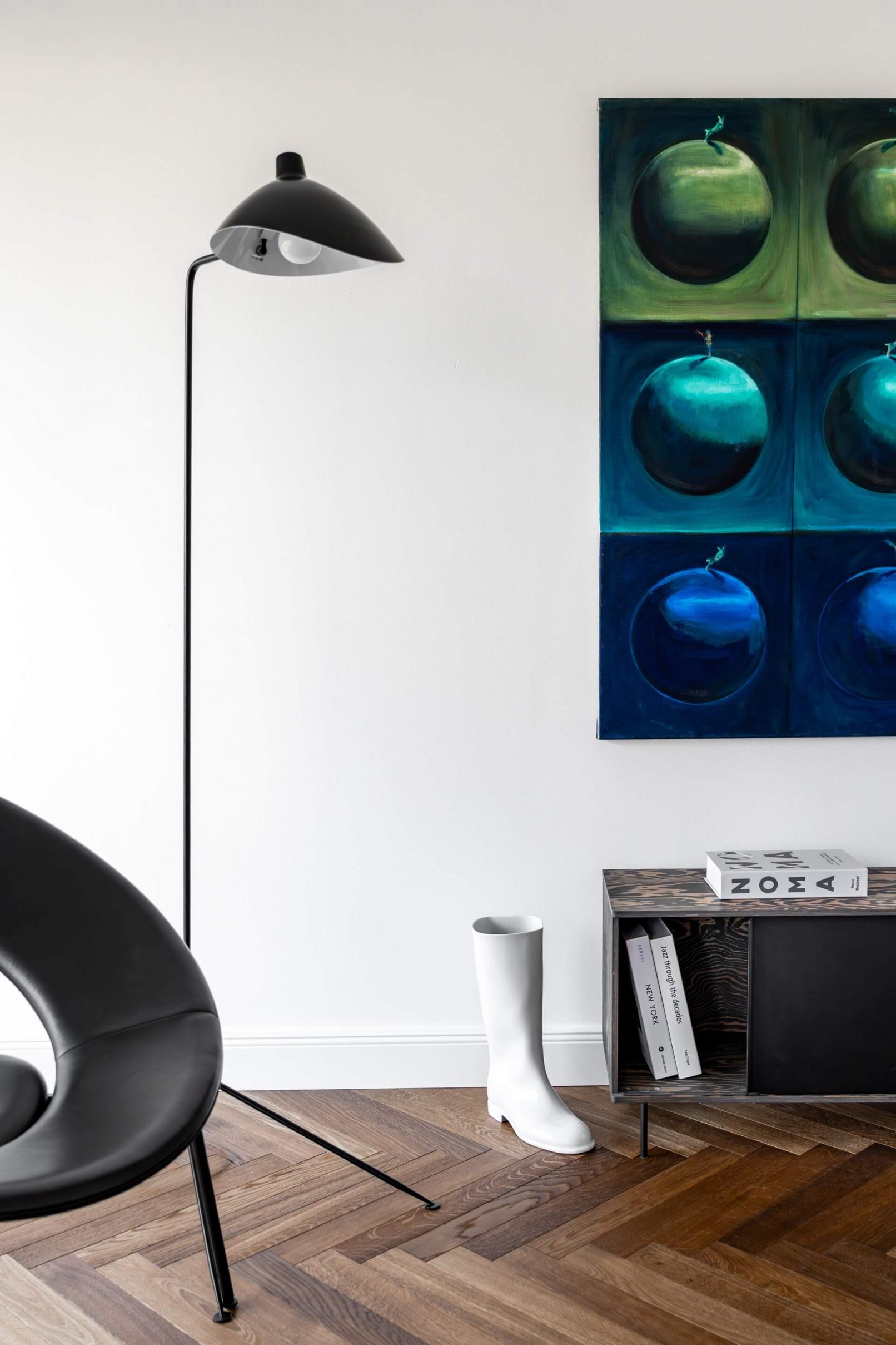 Vestavný nábytek byl vyroben na míru danému prostoru a to včetně bílých lakovaných dveří. Na podlaze je mořená dřevěná podlaha Frevini v odstínu Choco v pokládce herrigbone. Olištováno je vysokými bílými lištami. Za vanou je tapeta vhodná do vlhkého prostředí. Dlažba a obklady byly voleny v jemných zemitých tónech.