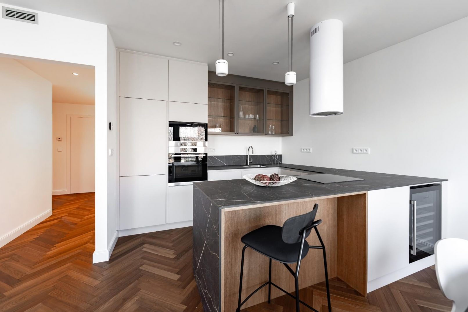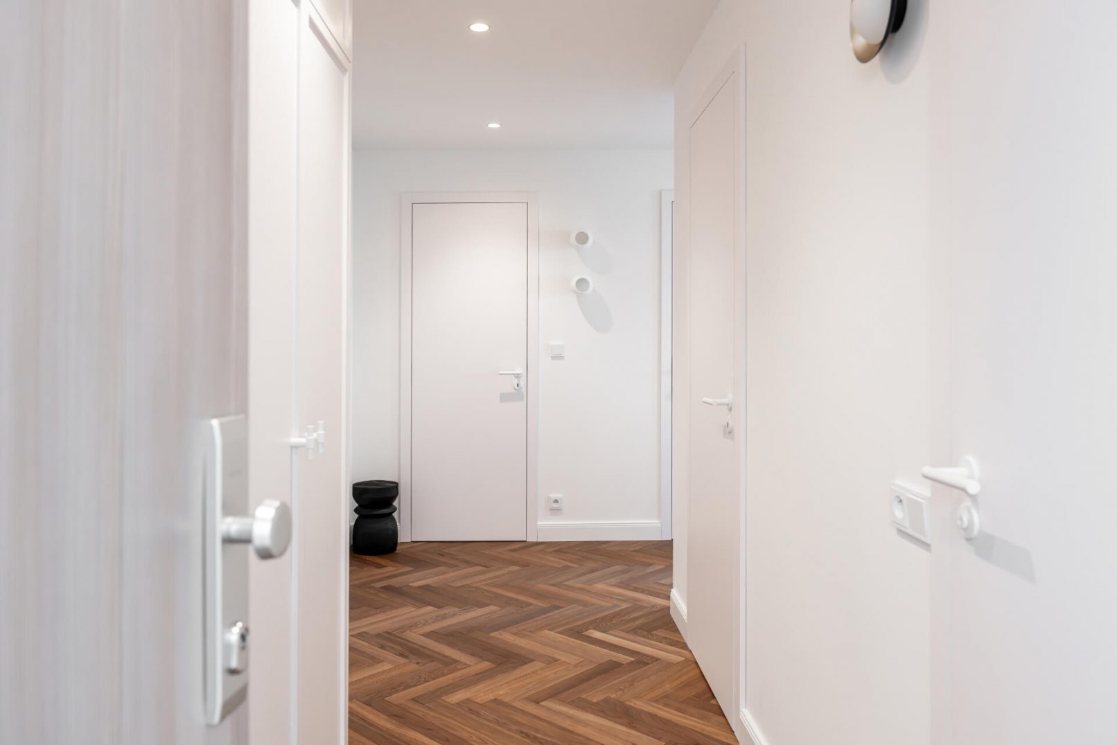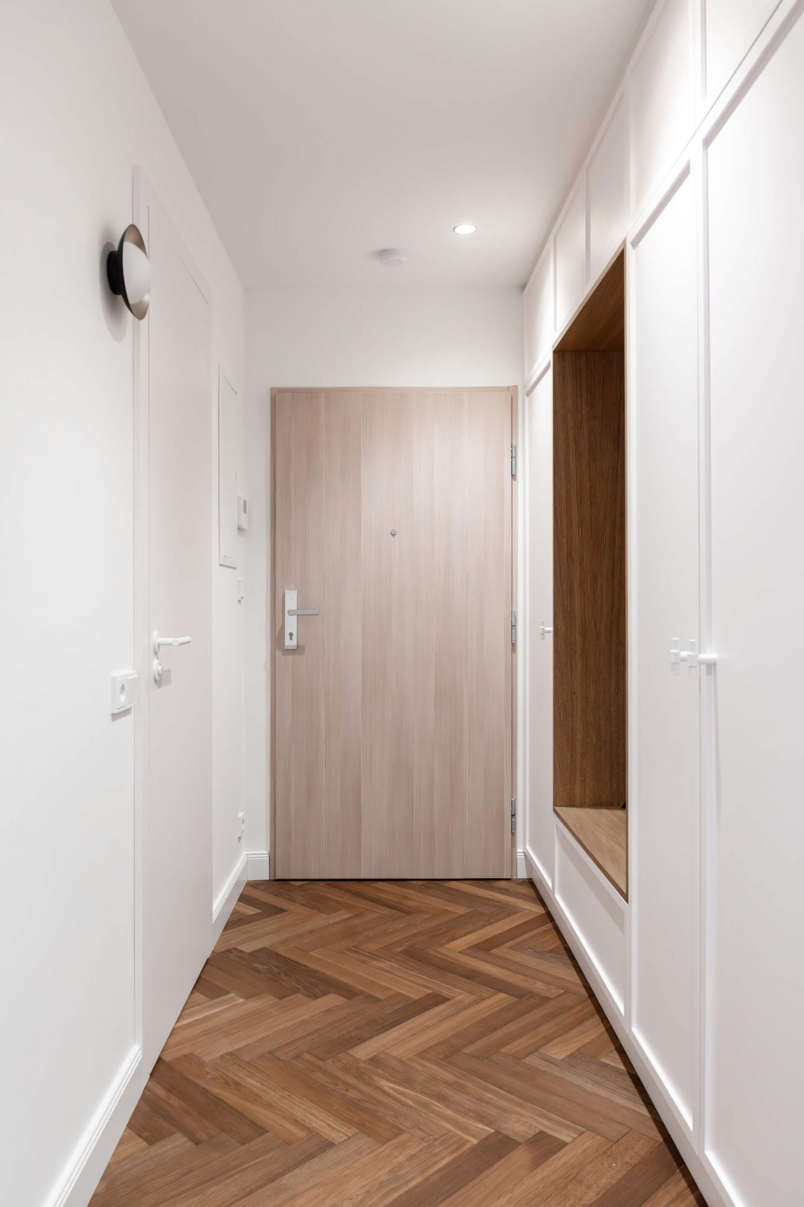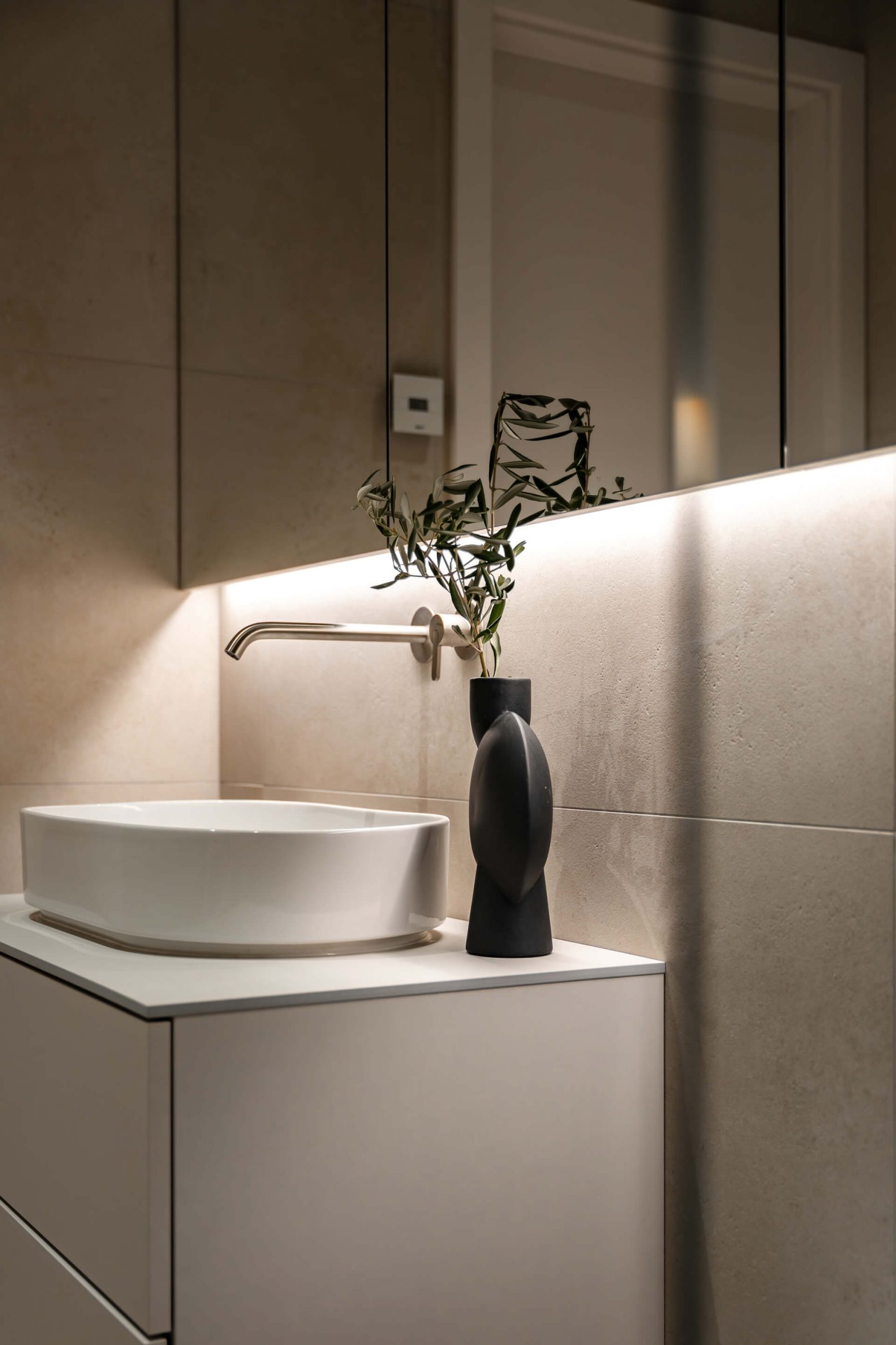 Pracovali jsme na úpravách bytu již od hrubé stavby celého bytového domu. Díky tomu jsme uzpůsobili dispozice přímo majitelům. Vznikl tak plnohodnotný byt 3+KK. Hlavní obytnou část tvoří obývací pokoj s KK a jídelnou a dvě ložnice. V návrhu vznikly dvě koupelny, jedna s volně stojící vanou a jedna se sprchovým koutem. Součástí bytu je i samostatná technická místnost a velká šatna. Další úložný prostor je řešen na chodbě v šatní skříni.