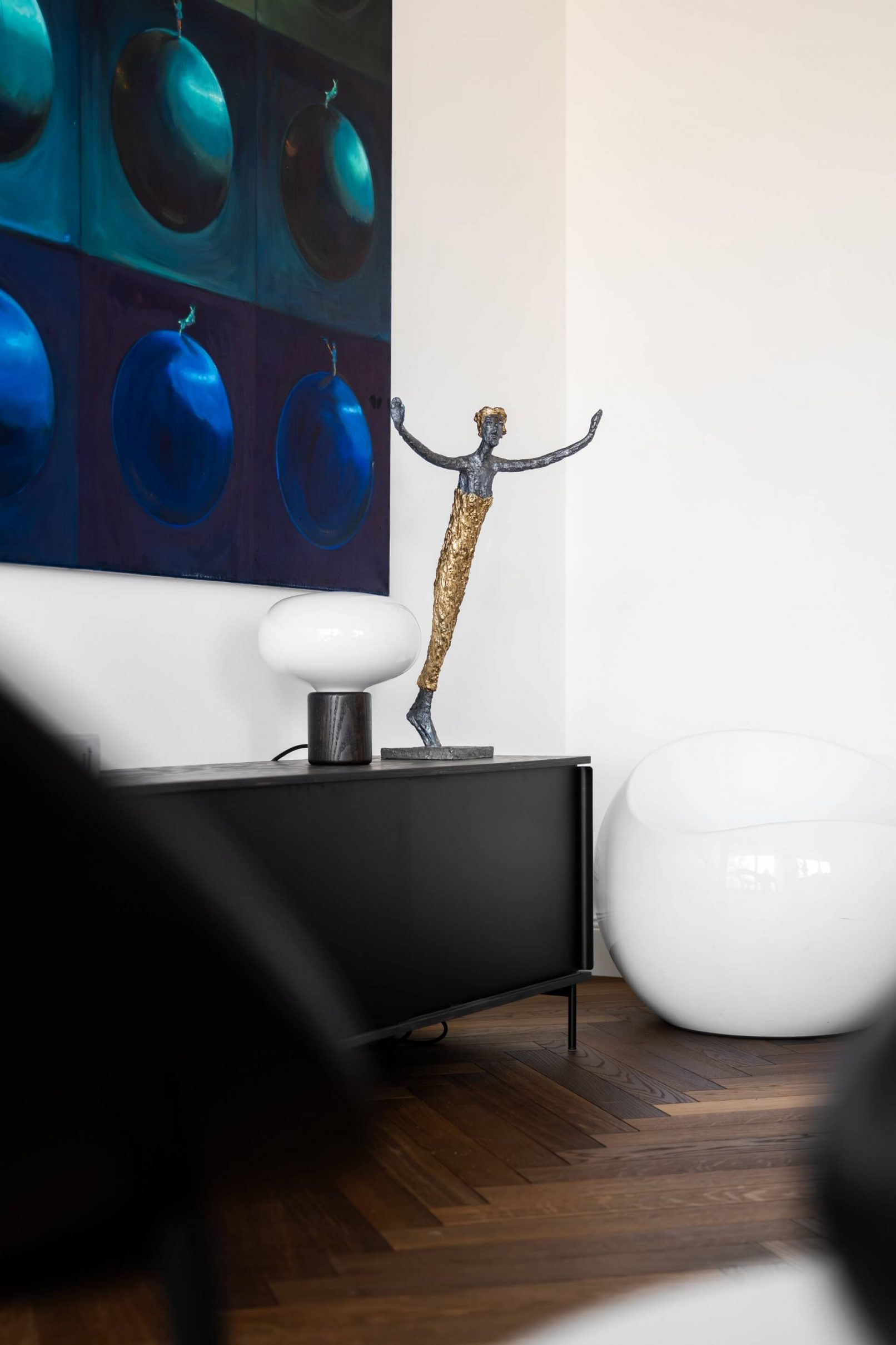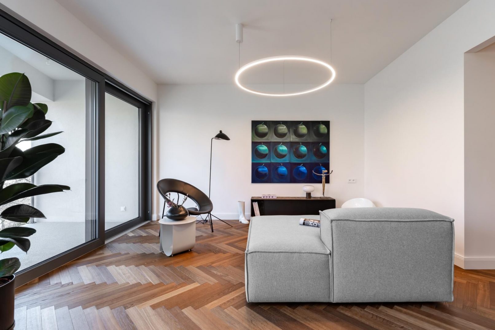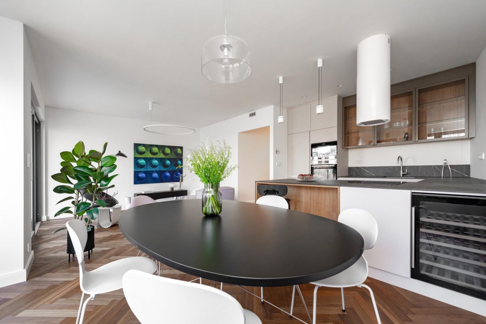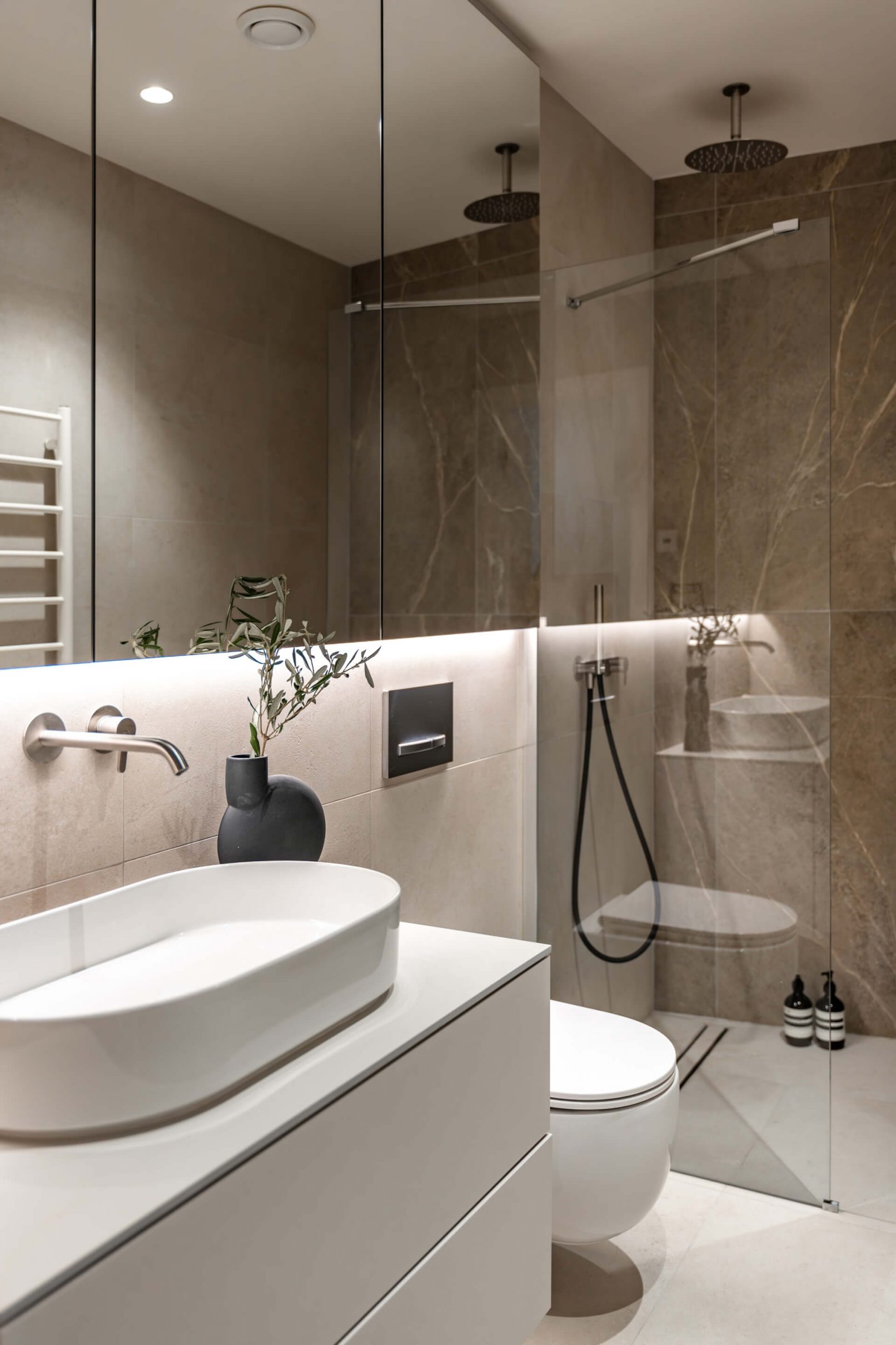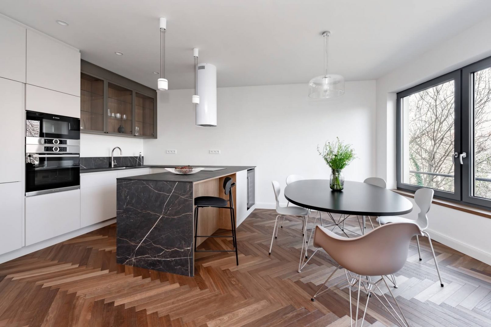 Pracovali jsme na úpravách bytu již od hrubé stavby celého bytového domu. Díky tomu jsme uzpůsobili dispozice přímo majitelům. Vznikl tak plnohodnotný byt 3+KK. Hlavní obytnou část tvoří obývací pokoj s KK a jídelnou a dvě ložnice. V návrhu vznikly dvě koupelny, jedna s volně stojící vanou a jedna se sprchovým koutem. Součástí bytu je i samostatná technická místnost a velká šatna. Další úložný prostor je řešen na chodbě v šatní skříni.