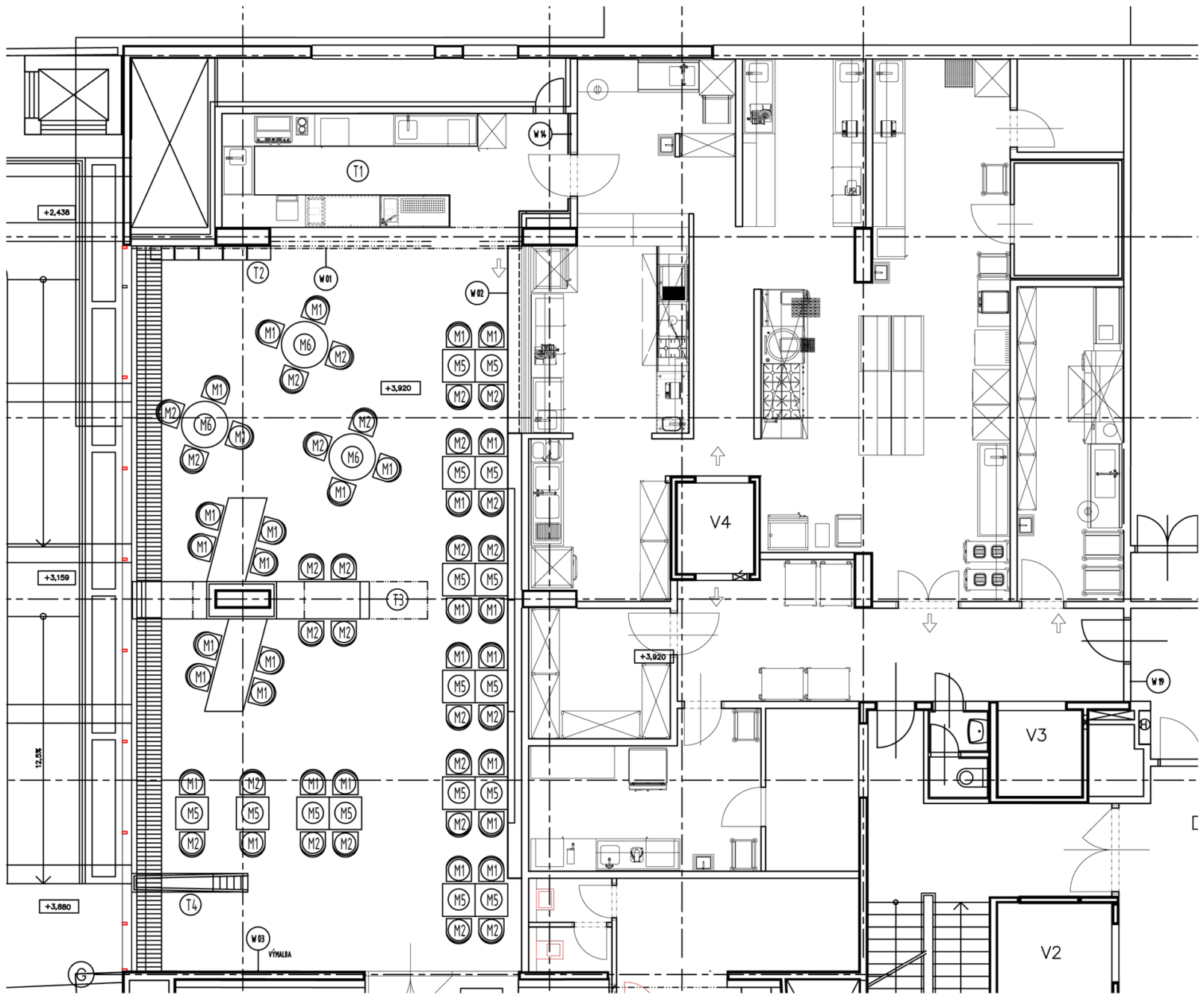 Samotná restaurace je obdélníkového půdorysu s barem v zadní části. Vedle baru je potom vstup do zázemí restaurace a kuchyně.