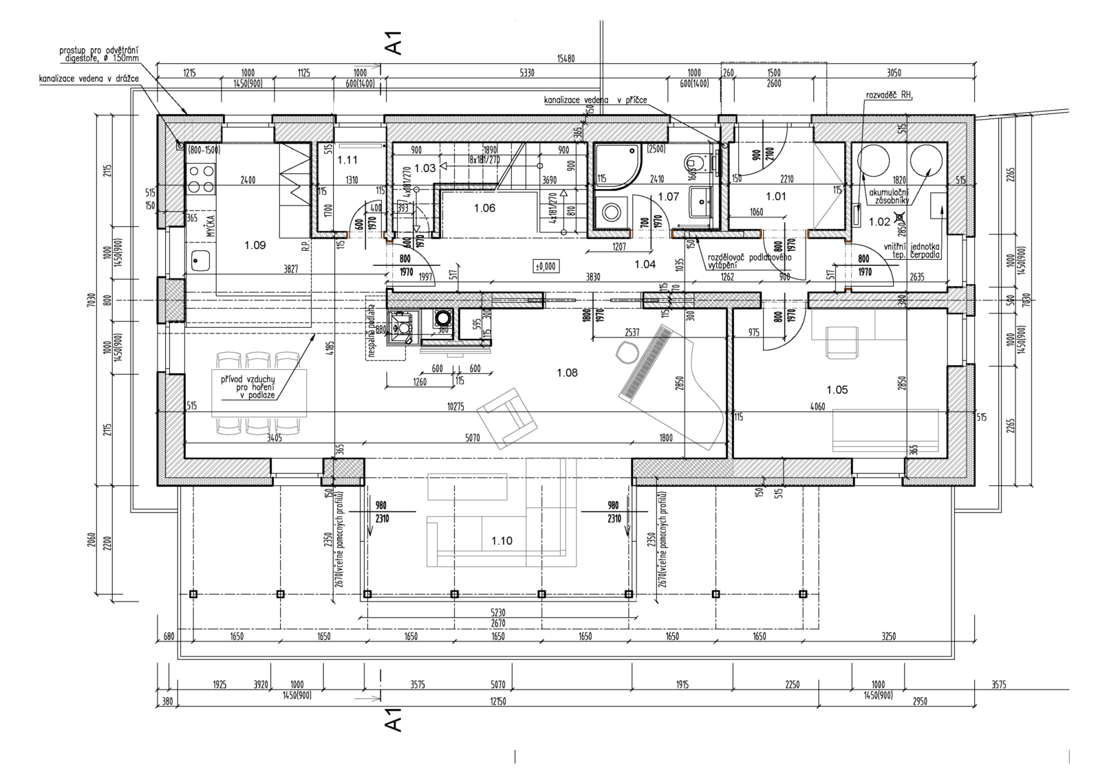 V přízemí se nachází velká obytná místnost s kuchyní a jídelnou, pokoj pro hosty a technická místnost s tepelným čerpadlem. V patře jsou ložnice dětí a rodičů se dvěma koupelnami.